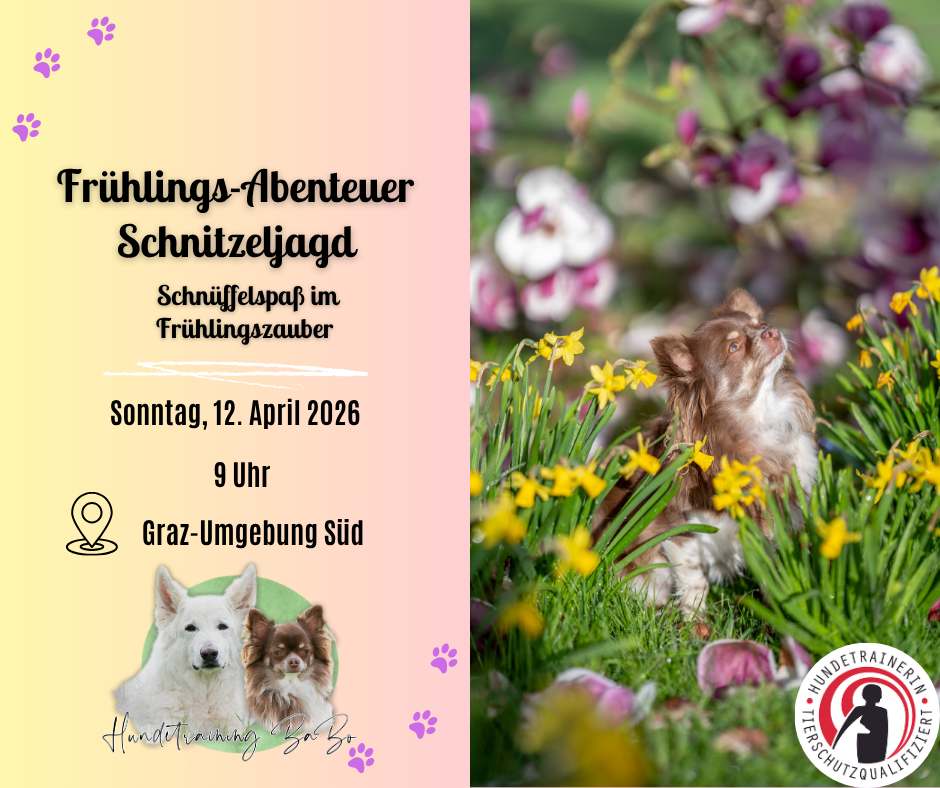 Der Frühling ist da – und mit ihm die perfekte Zeit für ein gemeinsames Abenteuer an der frischen Luft! Bei unserer Frühlingsschnitzeljagd für Hunde gehen Mensch und Vierbeiner gemeinsam auf Entdeckungstour. An verschiedenen Stationen warten spannende Aufgaben, Suchspiele und kleine Überraschungen rund um die Themen Natur, Bewegung und Teamarbeit.